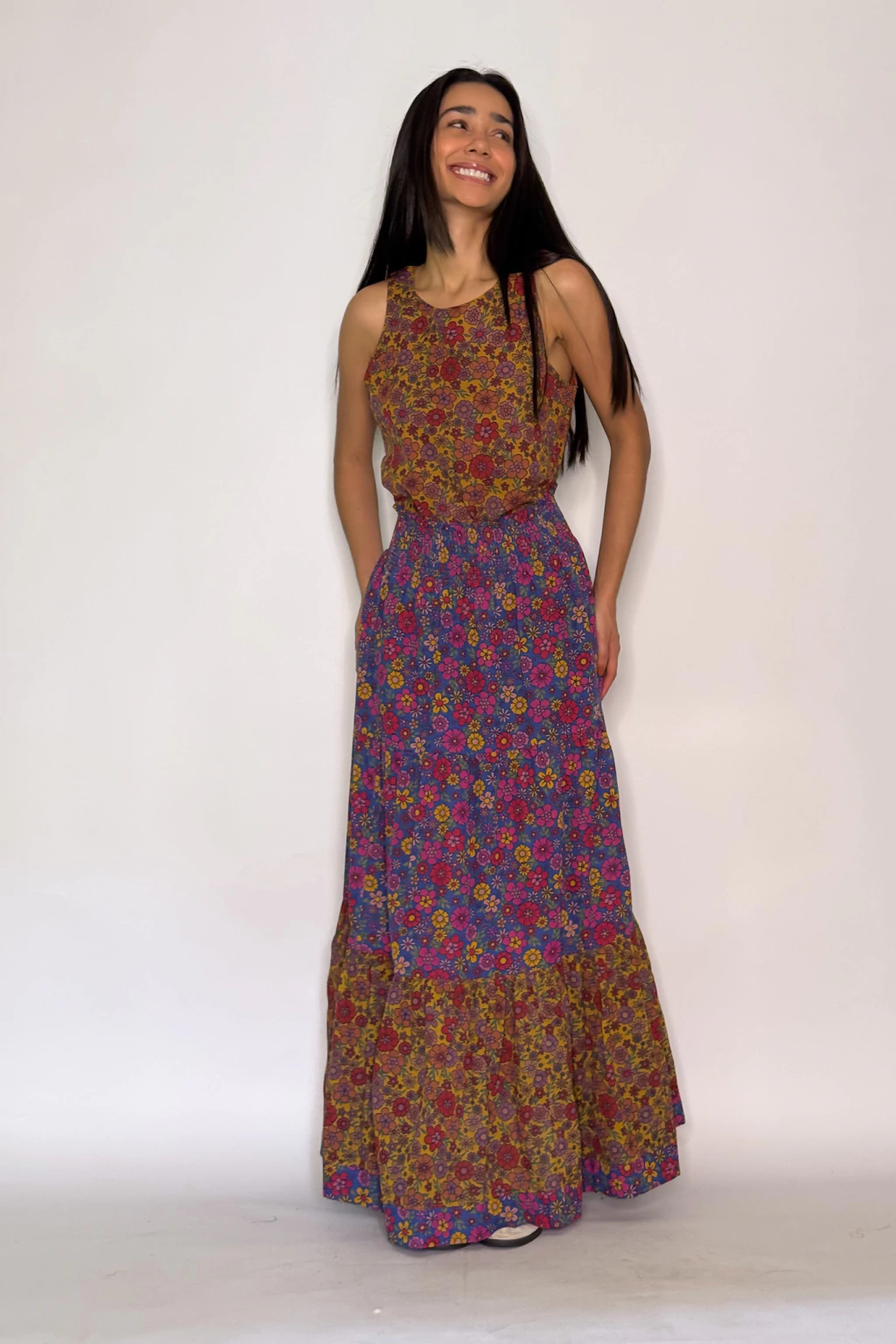 A saia longa tem três babados largos e lastex na cintura, garantindo ajuste e conforto. O primeiro babado é forrado com a própria chita, oferecendo opacidade, enquanto o terceiro cria um efeito de composição de cores com o restante da peça, que mantém a mesma estampa.