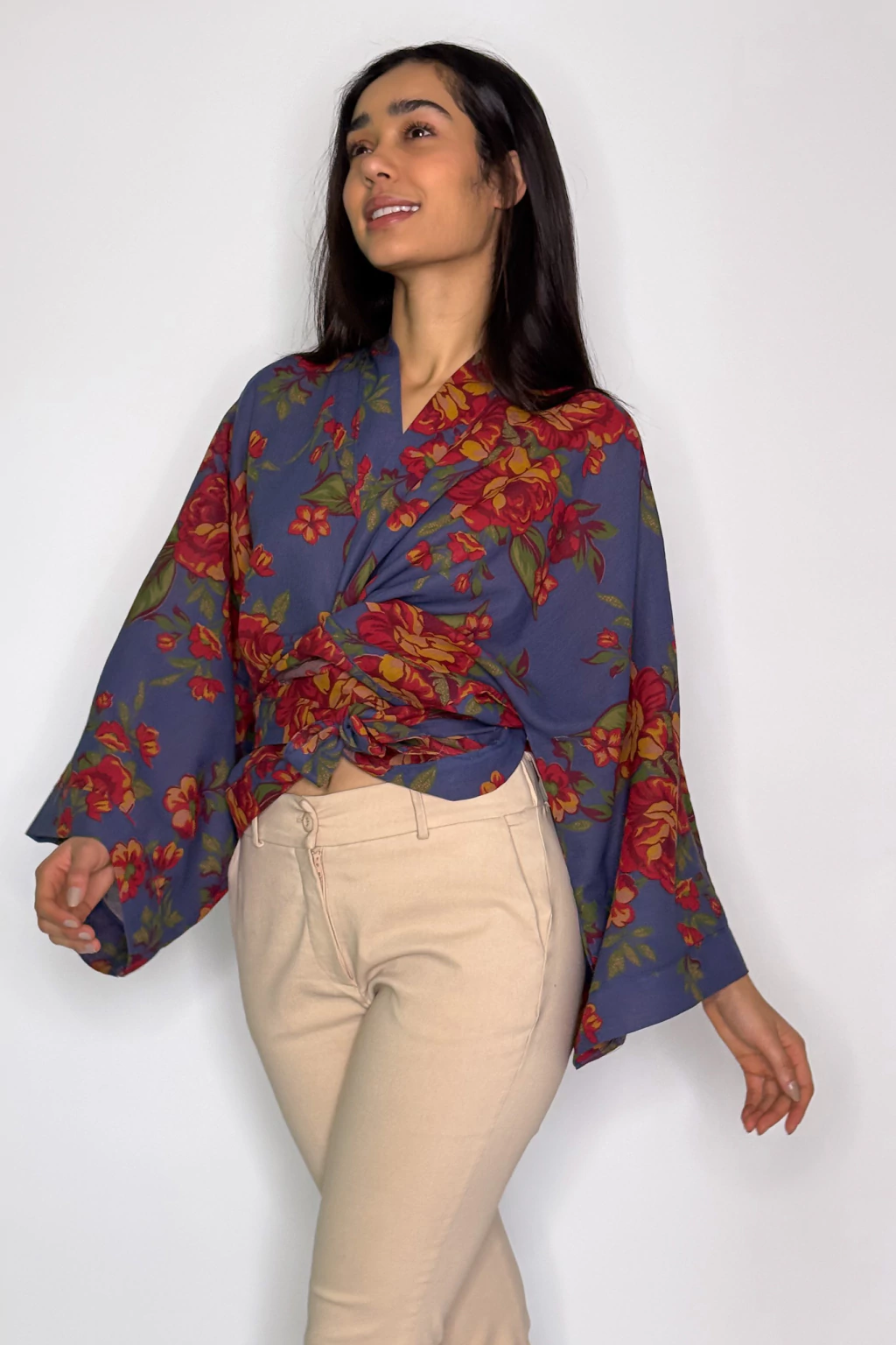 com um total de 136 cm de circunferência, 61 cm de manga e 52 cm de altura, você pode usá-lo fechado, como um kimono clássico, ou então, dependendo da amarração, como uma blusa mais decotada, perfeita para um look mais ousado.